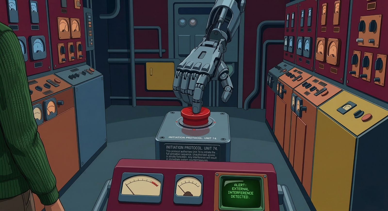 Illustration of a robotic hand about to press a trigger button, with a human standing aside, representing the question of AI control in autonomous weapons